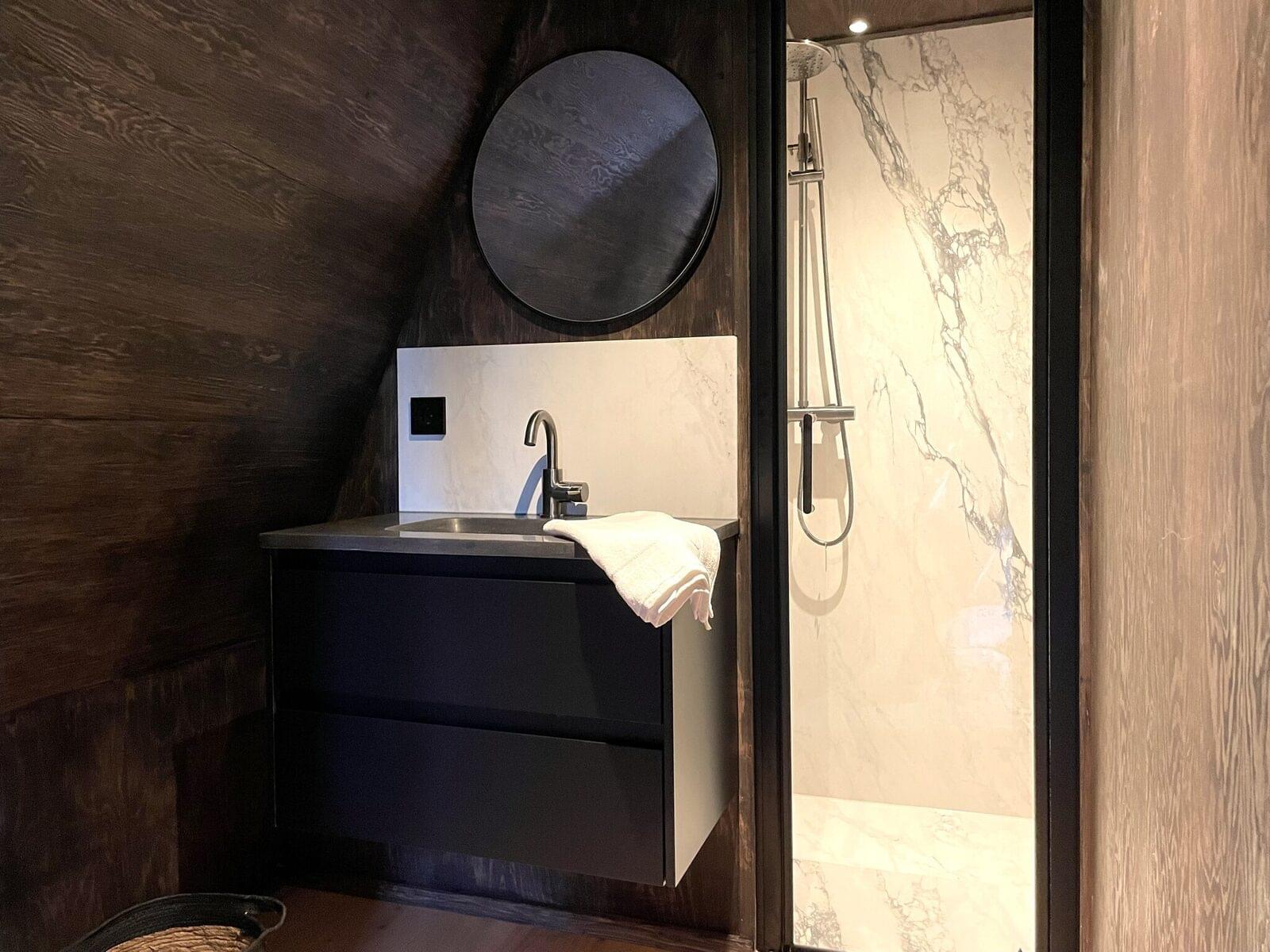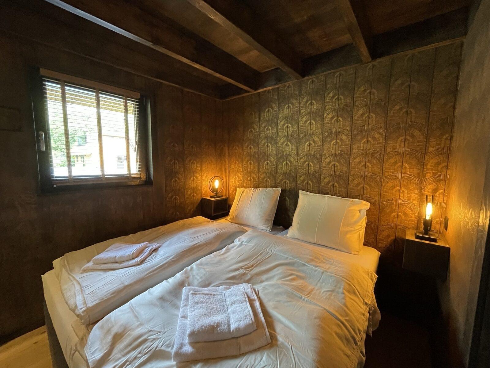 Im Obergeschoss befinden sich die beiden anderen Schlafzimmer mit gemeinsamem Bad. Ein Schlafzimmer ist mit einem Boxspring-Doppelbett ausgestattet, das zweite Schlafzimmer mit zwei Boxspring-Einzelbetten. Das luxuriöse Badezimmer verfügt neben Waschbecken und Toilette auch über eine verlockende Regendusche.