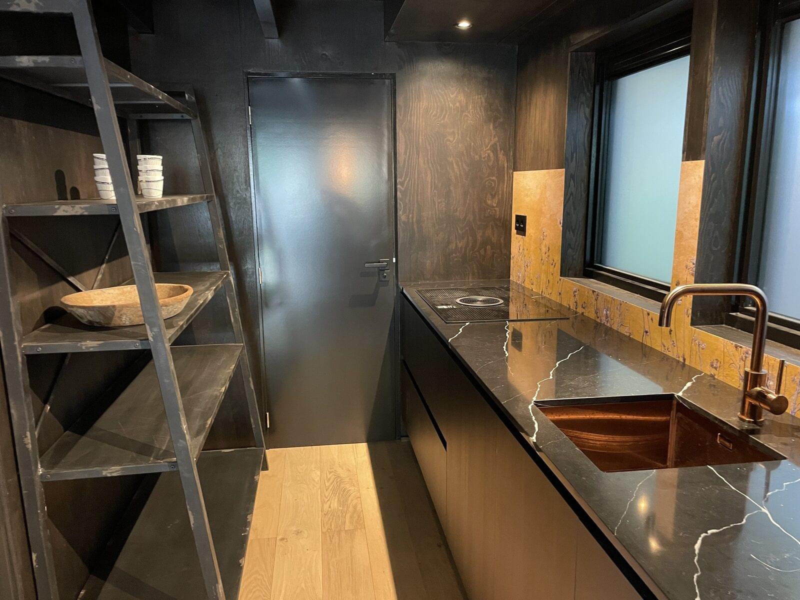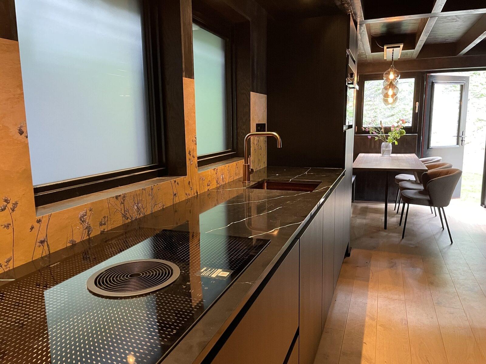 Die offene Küche ist mit allen modernen Annehmlichkeiten wie Induktionsherd, Spülmaschine, großem Kühlschrank und Kaffeemaschine ausgestattet.