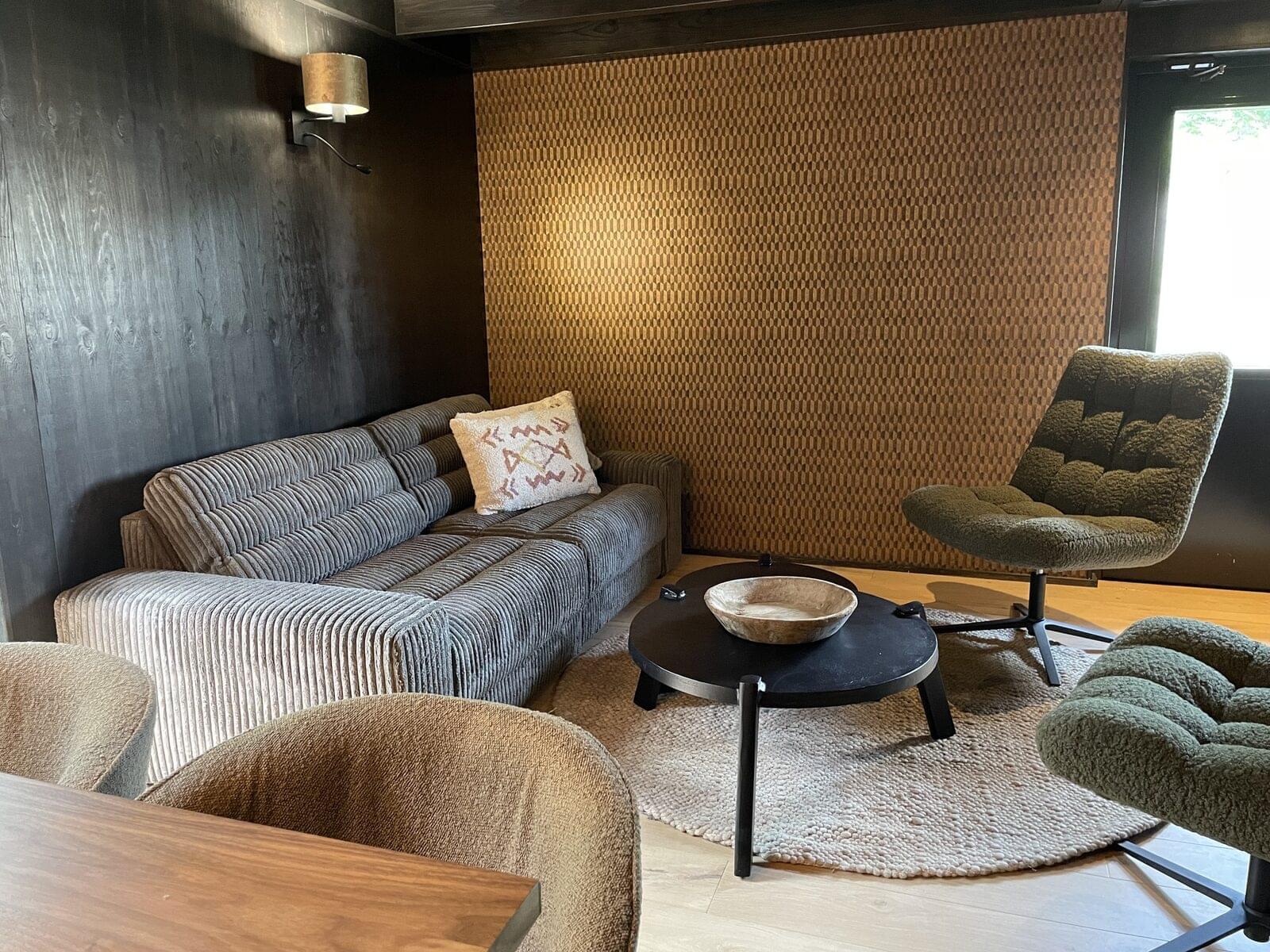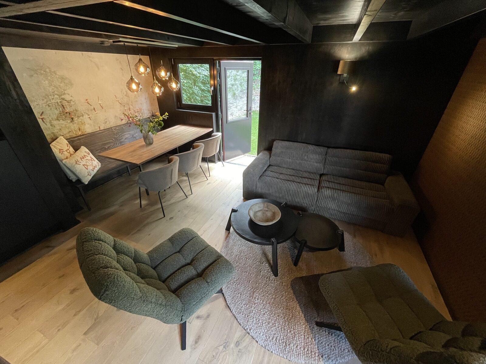 Das Wohnzimmer ist wohlig-warm und geschmackvoll eingerichtet: Es gibt eine bequeme Sitzecke, ein Smart-TV und einen schönen Esstisch.