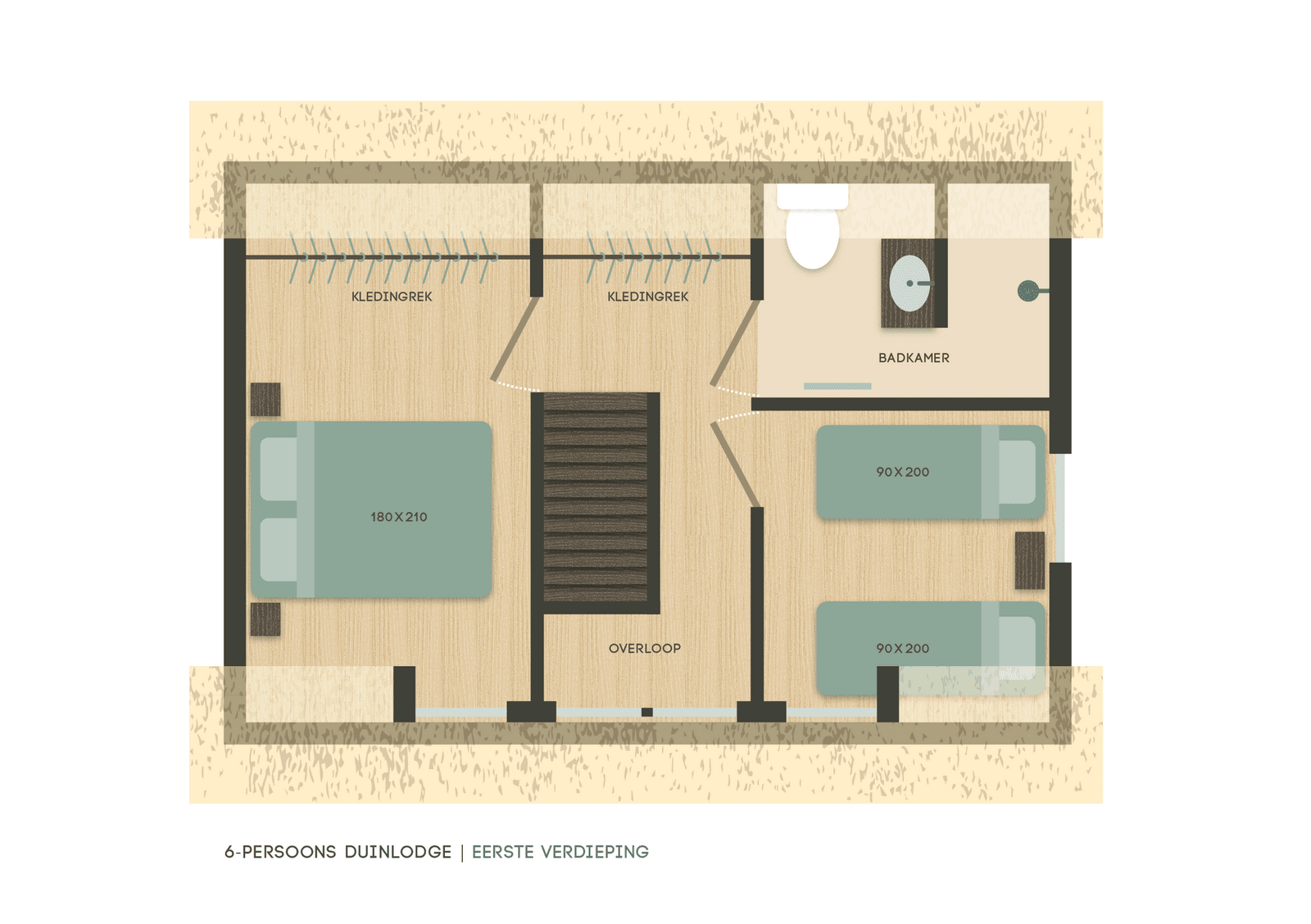 Die Dünenlodge hat 3 Schlafzimmer, von denen sich eines im Erdgeschoss befindet. Hier finden Sie auch ein Badezimmer mit Dusche und Toilette. Ideal für Gäste, die nicht mehr so gut zu Fuß sind!